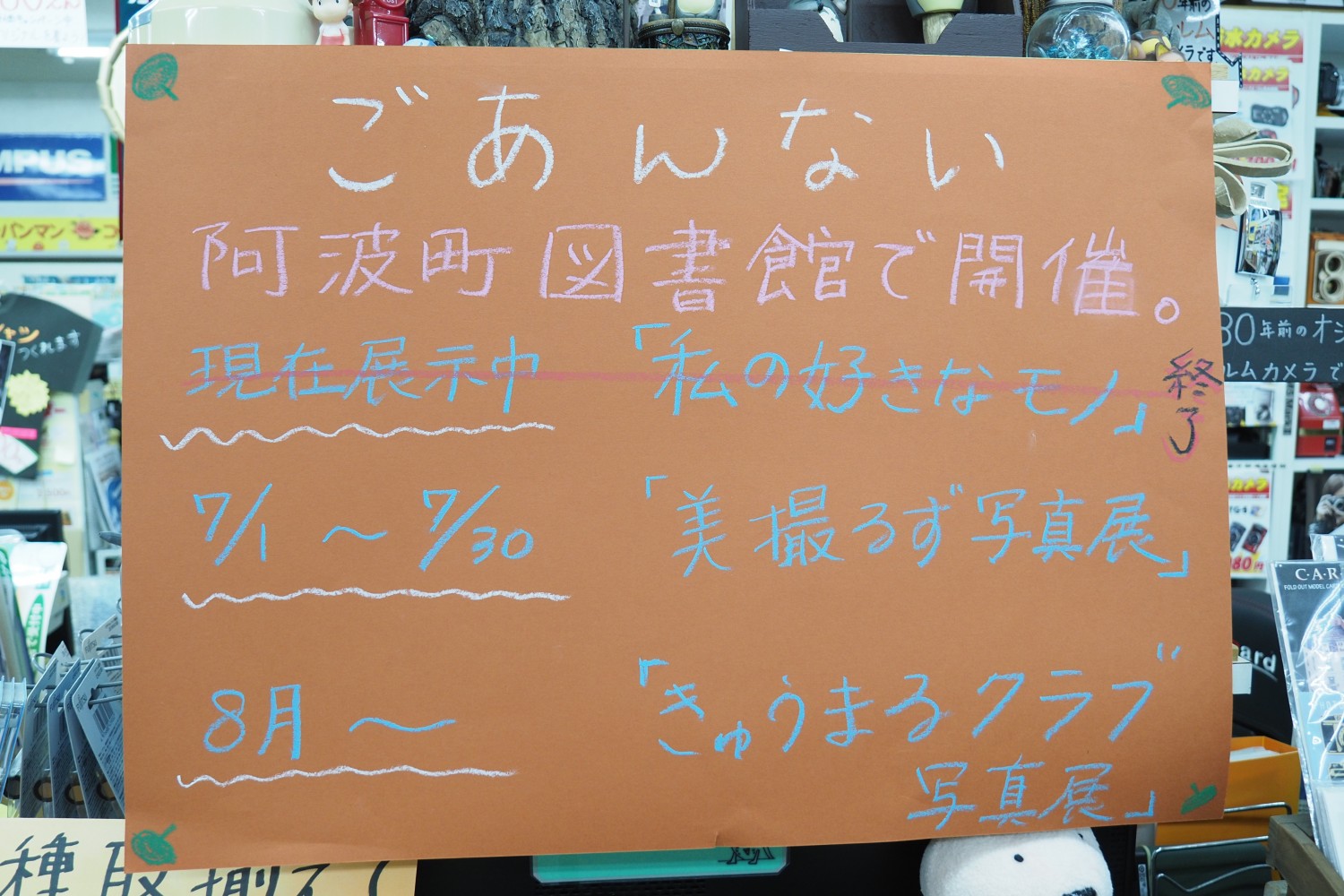 阿波町図書館にて7月30日まで美撮るずの写真展です。